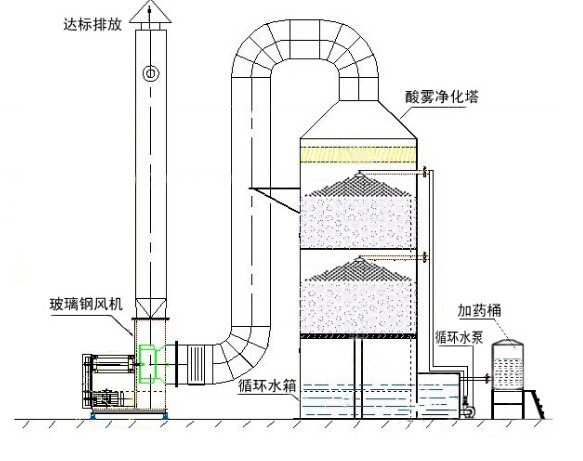 塔板叶片如固定的风车叶片,气流通过叶片时产生旋转和离心运动,吸收液通过中间盲板均匀分配到每个叶片,形成薄液层,与旋转向上的气流形成旋转和离心的效果,喷成细小液滴,甩向塔壁后。液滴受重力作用集流到集液槽,并通过降液管流到下一塔板的盲板区。具有一定风压、风速的待处理气流从塔的底部进,上部出。吸收液从塔的上部进,下部出。气流与吸收液在塔内作相对运动,并在旋流塔板的结构部位形成很大表面积的水膜,从而大大提高了吸收作用。每一层的吸收液经旋流离心作用掉入边缘的收集槽,再经导流管进入下一层塔板,进行下一层的吸收作用。