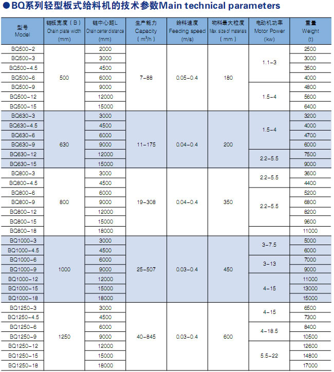 | 轻型板式给料机用来处理100mm-200mm块状物料,广泛用于有色、矿山、水泥、化肥、化工、冶金造纸等行业的采选、轻运、配料等工艺过程中,适用于沿水平或倾斜段向工作机械或料仓、漏斗等其他容器连续均匀地输送物料。物料容重不大于1.2t/m3,块重不超过140kg,温度不高于350℃的散状物料。WBL 中型板式给料机(简称板喂机)是一种散状物料输送设备,把间歇式给料转变为连续性给料。本公司在引进国外先进技术上全新开发的 WBL 型板喂机,具有牵引力大,漏料少,运行平稳,使用寿命长,检修方便的优点。 |
